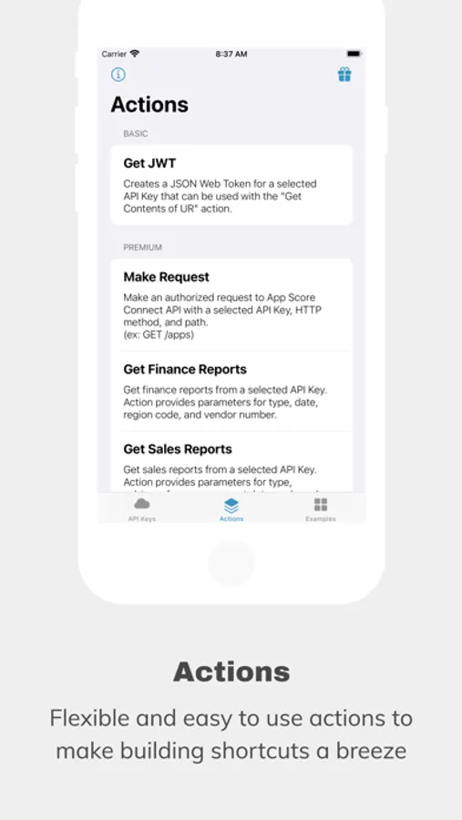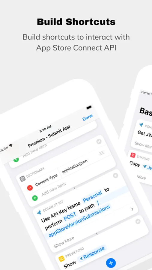 A Shortcut action to create a JSON Web Token (JWT) for authorization in HTTP requests is included for everyone! It can be used with the "Get Contents of URL" action to make requests to the App Store Connect API.