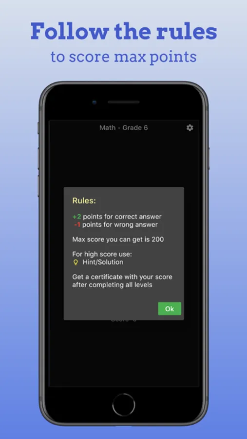 Challenge your mind with 6th grade level Math and see where you stand. There are 100 questions/levels sprinkled with some interesting Math puzzles in between. Create and share a certificate of your final score. Challenge your friends and family to see who can score the most.