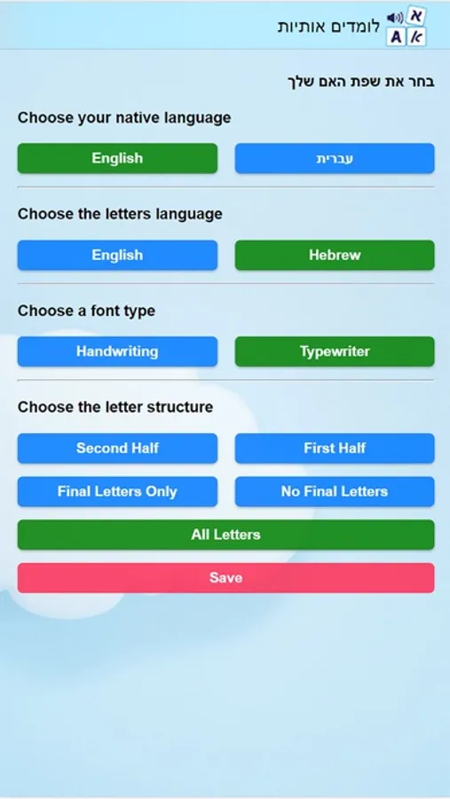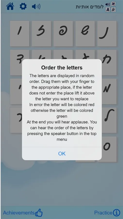 2. Self tests - the letters appear in random order, each time you will be asked to click on a letter if you click on the correct letter the letter will be colored green and you will hear encouragement, If you're wrong the letter will be colored red and you will be asked to try again