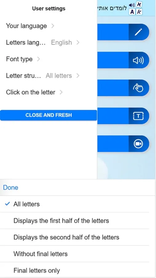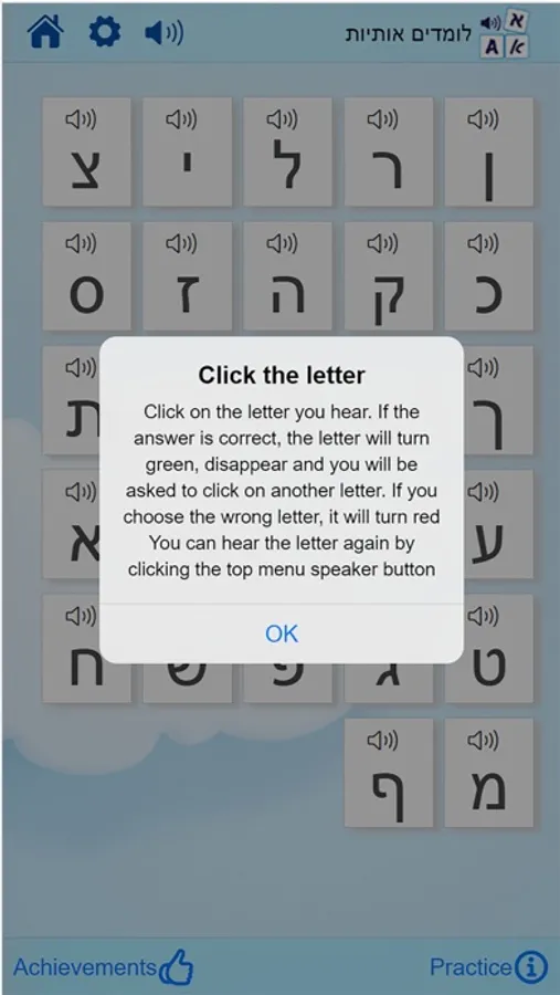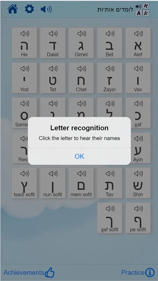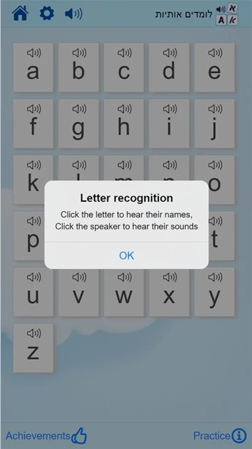 1. Recognize the letters - all the letters are arranged in order, you can click on them and hear their name & sound
