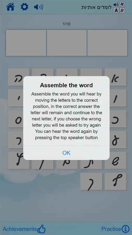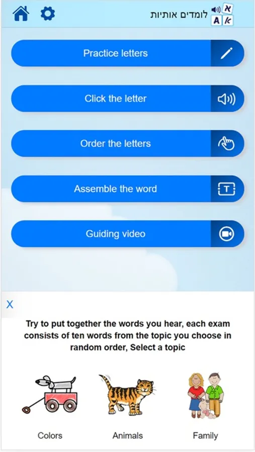 4. Assembling a word - yoc can choos a word bank by topics: family, animals and colors each topic contains up to ten words. After selecting the topic, you will hear a word and you will be asked to drag the letters to the appropriate box. on the correct letter you will hear encouragement, If you're wrong you will be asked to try again