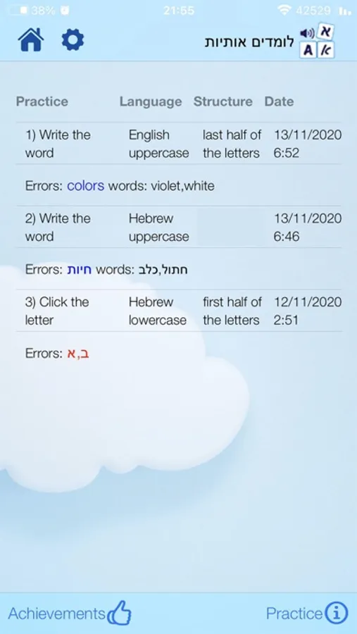 You can see the achievements including the name of the stage, date, time and type of writing we used