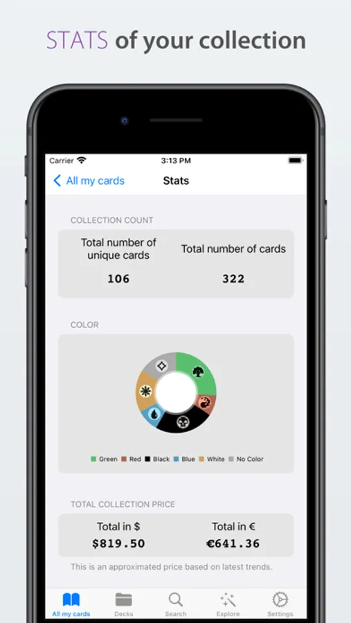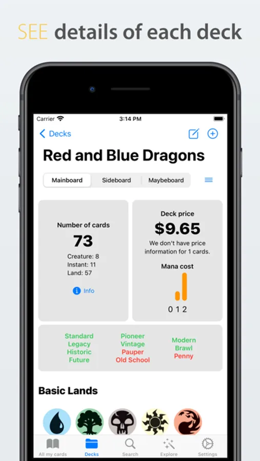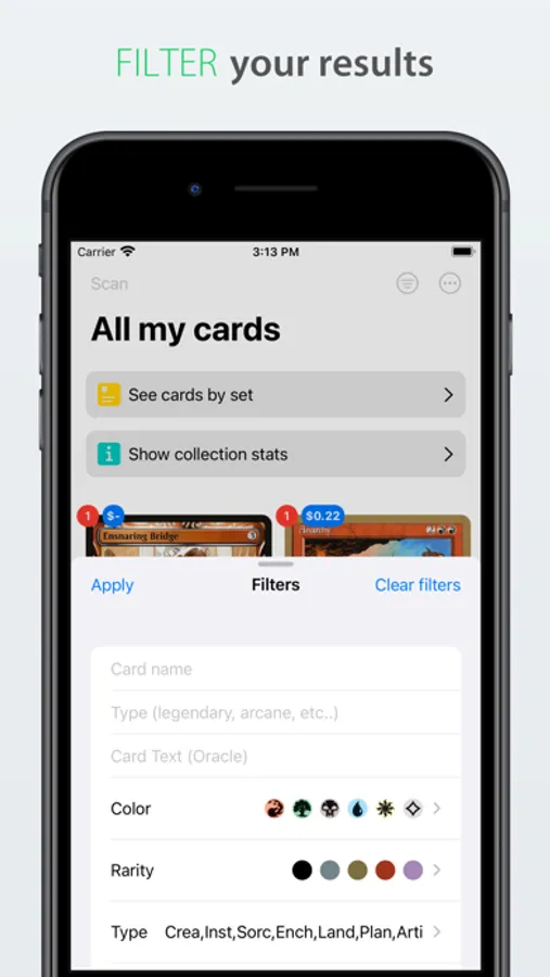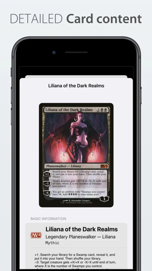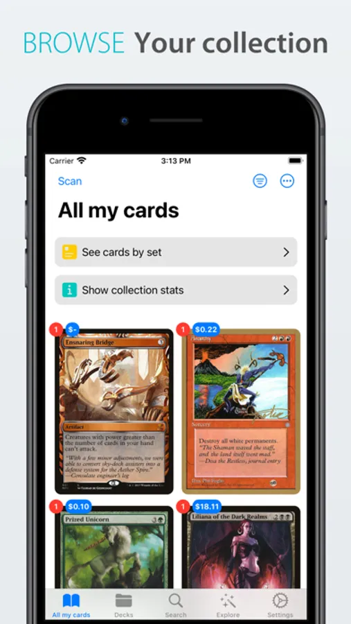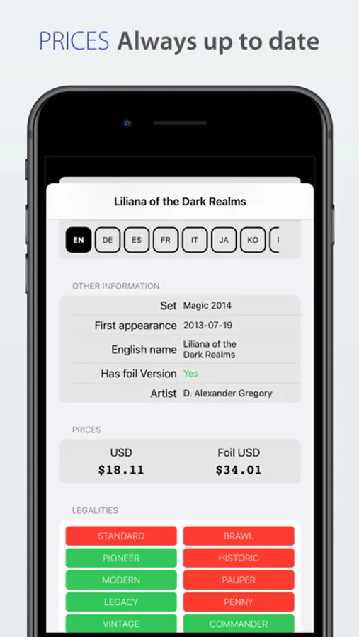 Quickly scan and save all your cards into your Binder collection, check each card price in real-time. You will be able to see a lot of details for each card: legality, all the card editions, first appearance date, and more!