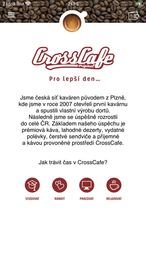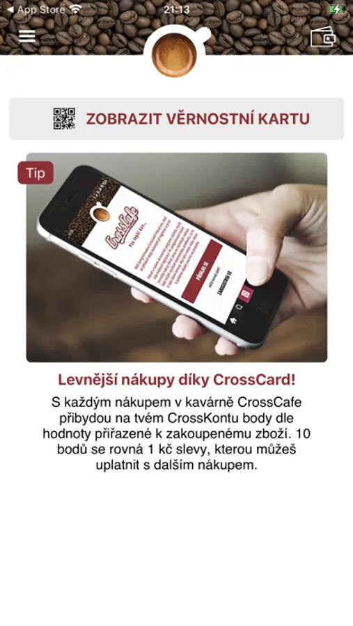 Naše aplikace slouží k tomu, abys měl přehled o svém CrossKontu, nákupech a o všem, co je spojené s tvojí oblíbenou kavárnou.
