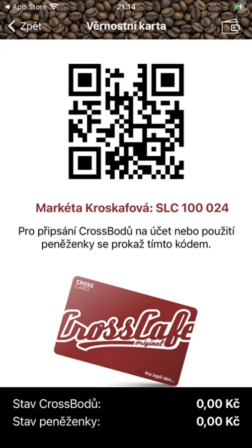 Při placení ukaž svoji kartu (QR kód) a barista ti načte CrossBody za nákup (u položek, kde jsou body k dispozici). Zobrazí se ti stav konta a později tyto body můžeš proměnit ve slevu. Budeš mít k dispozici elektronický přehled o svých nákupech přímo v aplikaci CrossCard.