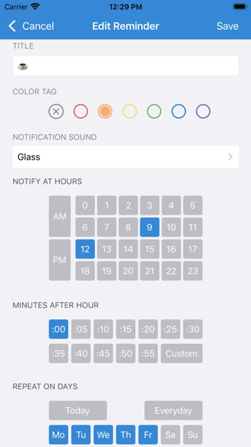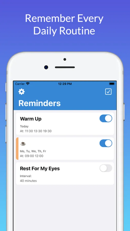 You can set recurring alerts for all your activities and routines throughout a day. Easily configure hourly chimes or some custom intervals that will repeat on any day of you preference. App is also a perfect tool to help you with the new habits.