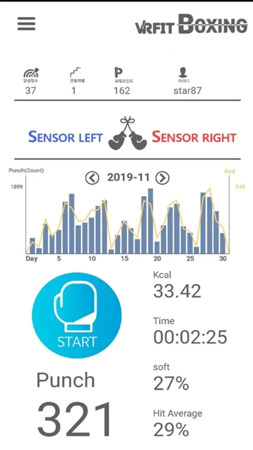 The IoT sensor developed by M2Me measures the strength of the fist of a boxing exercise through complex signal processing of 9 axis sensors such as acceleration, gyro, and compass. The sensor can be attached to the left and right glove or holding it in the hand.