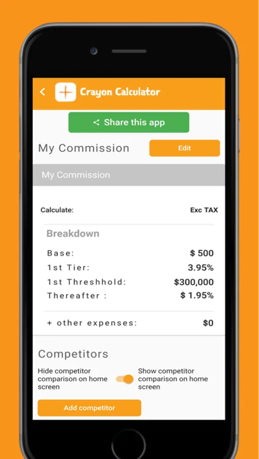 Crayon Calculator is a tool used for in-person sales where you are able to add your commission rates including any flat rates, scaling commissions, taxes and other costs. You are then able to add your competitors rates and create instant comparisons to use when presenting to your potential customers. With Crayon Calculator you are able to add your own branding and colours for a sleek and professional tool.