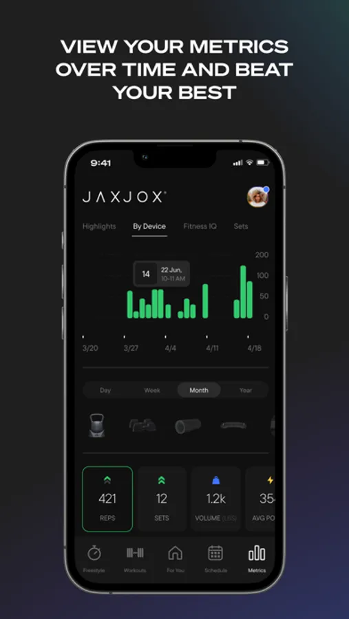 Connect JAXJOX equipment to the app and track reps, sets, total volume, power, heart rate, recovery time, and more. It's never been easier to follow your workout journey, rep by rep, pound by pound, whether you work out your way or with our expert Coaches on-demand.