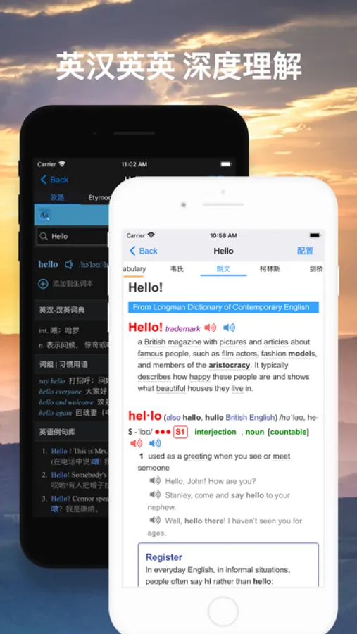 * 「英英模式」,通过英语释义、同义词和例句,加强记忆,扩展词汇量;