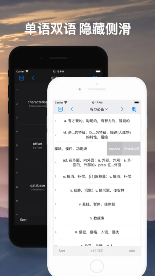 2. 只显示英文时,向左滑动单词行,可以看到中文释义。