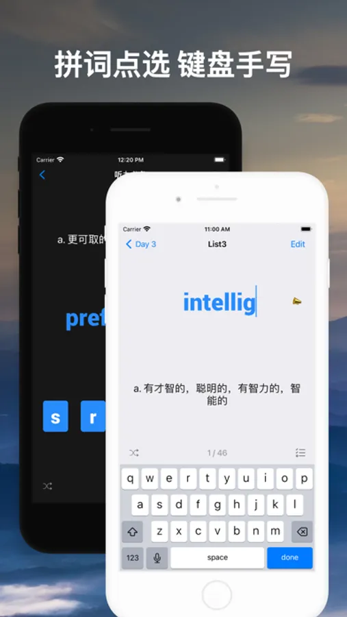 * 「拼词模式」:从五个卡片中点选正确的字母,拼成完整的单词,同时还支持键盘输入。iPad上,还支持Pencil手写输入;