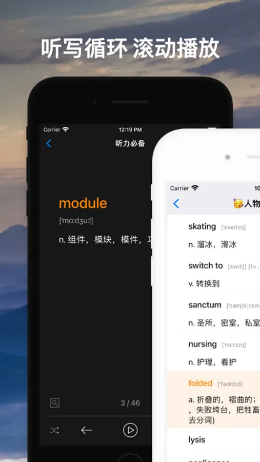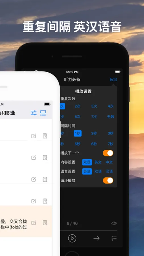 * 「听写模式」:可重复可间隔可循环可自动,英汉双语音频播放;
