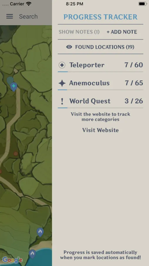 • Progress Tracker - mark locations as found and track the progress of your collectables.