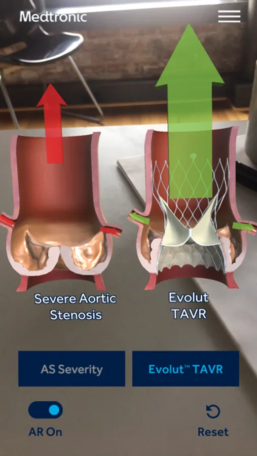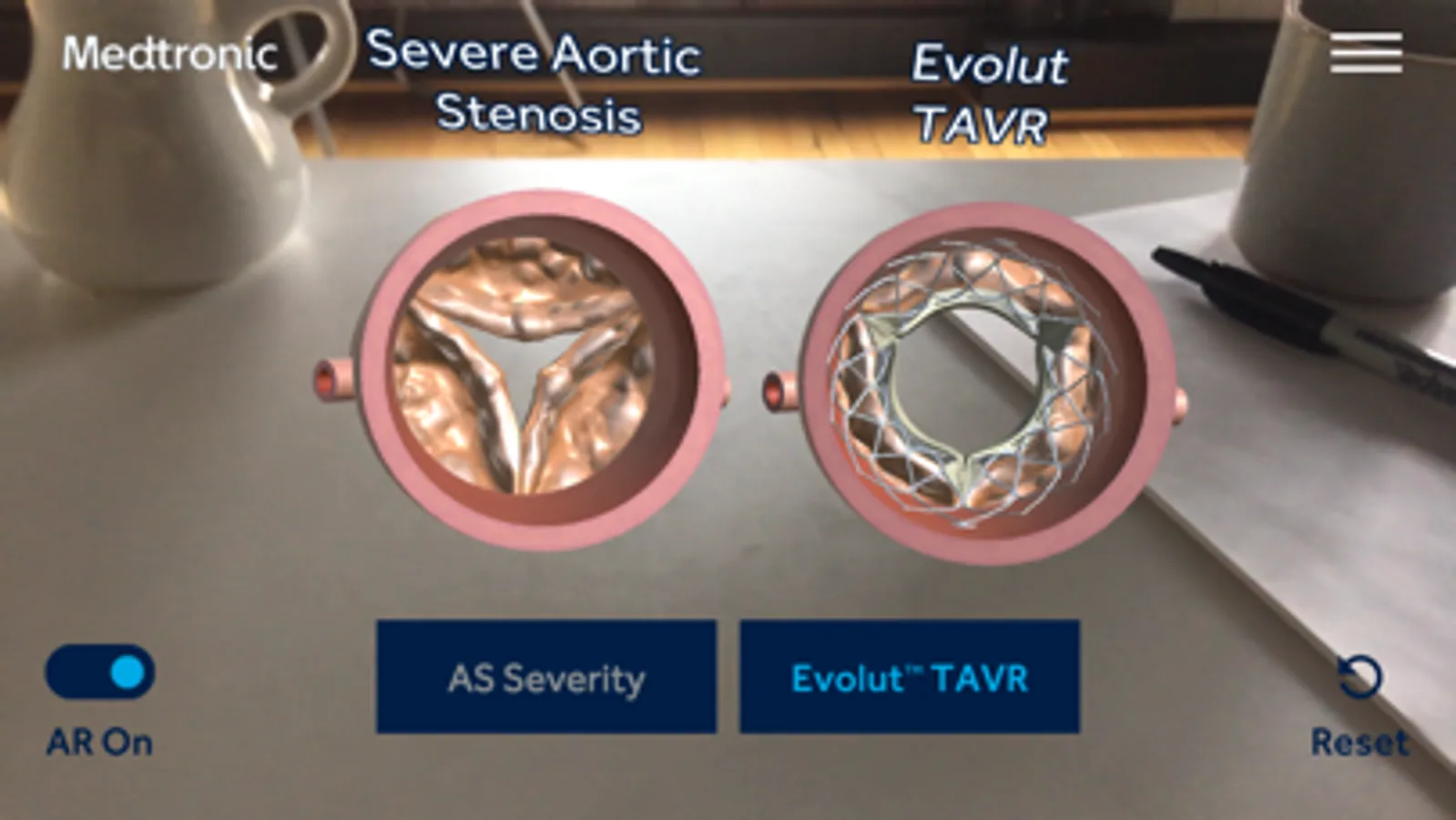 Using augmented reality, see the difference in blood flow of a severely diseased aortic valve treated with an Evolut™ TAVR platform, compared to an untreated severely calcified anatomy. Use this feature by pointing your mobile device camera to a flat surface to see a virtual model. The app also includes resources to support discussions with your patients.