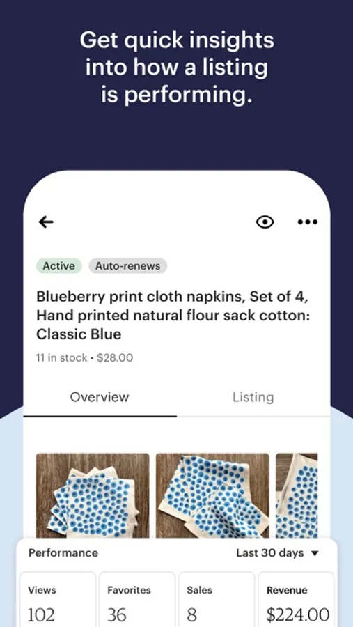-- Get key performance stats like views, sales, and revenue in a listing overview.