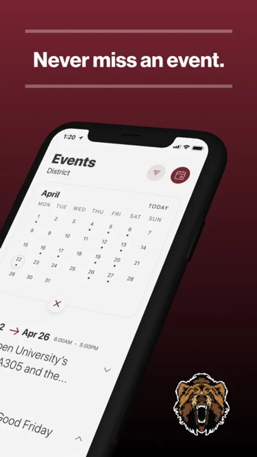 The event section shows a list of events throughout the district. Users can add an event to your calendar to share the event with friends and family with one tap.