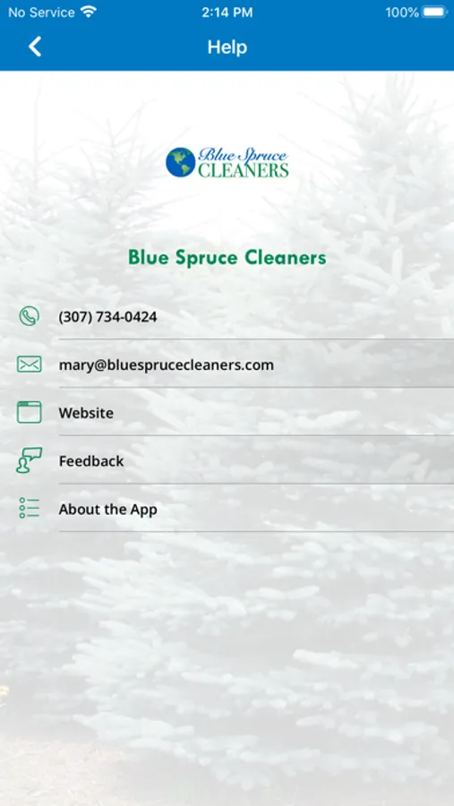5) Quickly contact Blue Spruce Cleaners by phone or email and access their website all directly from your device.