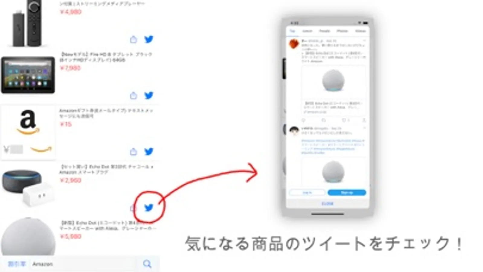 商品検索時はそのキーワードに関するツイートすぐにチェックできます。