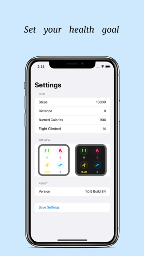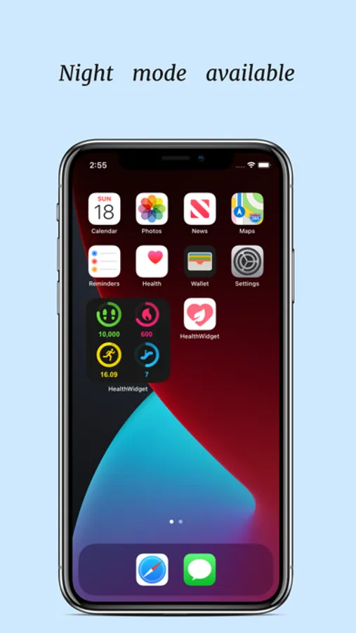 With HealthWidget+ you could easily customize your own health goal, including daily steps, walking distance, burned calories and flight climbed. You could check your health data via our widget. Both light mode and dark mode are available.