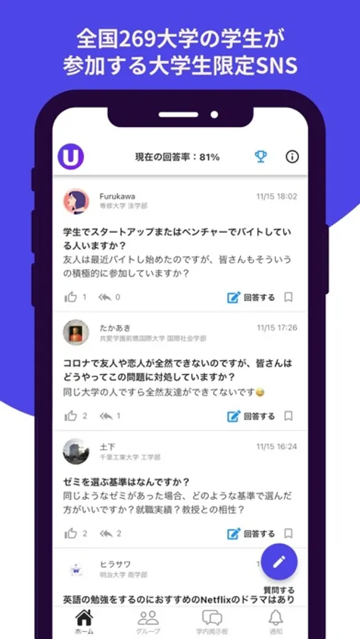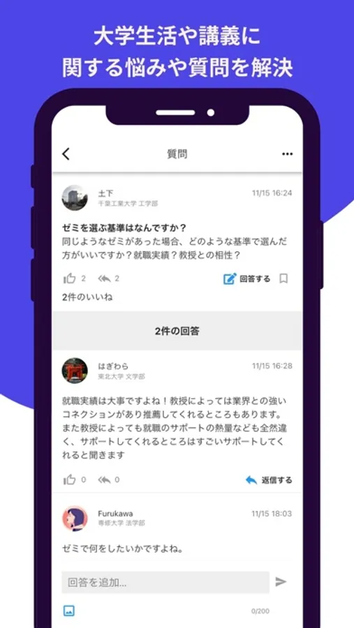 ▲ 普段の勉強、就活、大学生活、留学、バイトなど様々なことについて質問することができ、全国の大学生から回答を得ることができます。大学生の勉強には必須のSNSです。