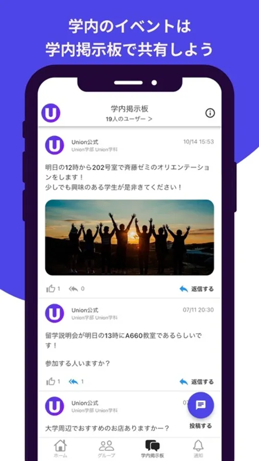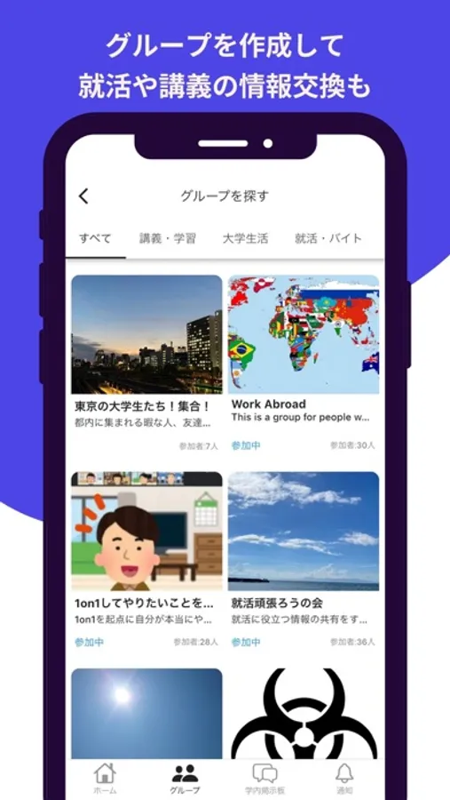 サークルやゼミのグループを作成し、学内の学生に向け情報発信をしたり、全国の大学生が参加できるオンラインサークルなども作成することができます。