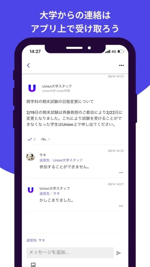 ▲ 大学がUnionに参加した場合に限り大学からの連絡をプッシュ通知で受け取ることができ、わざわざwebサイトを訪れることなく、そしてメールすることなく大学側にアプリ上で質問をし回答を得ることができます。