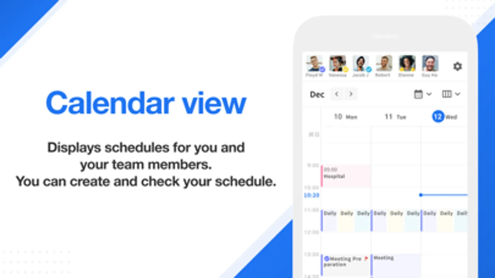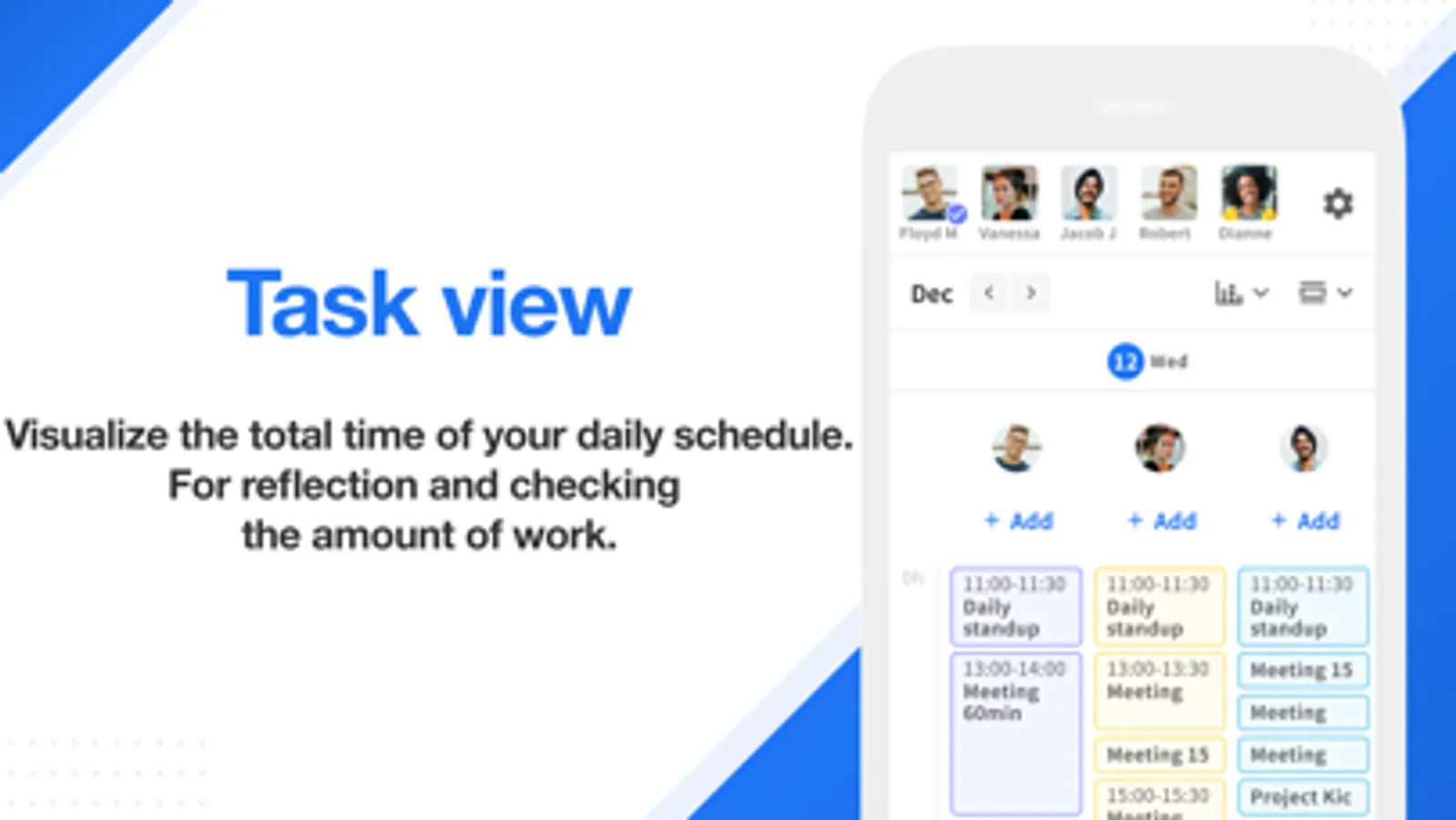 Show multiple calendars, including work and private calendars, and multiple team members' schedules together. It shows the schedules of multiple team members and multiple calendar services, including work and private ones, in a clean design that is easy to understand even when other team members' schedules are shown together.