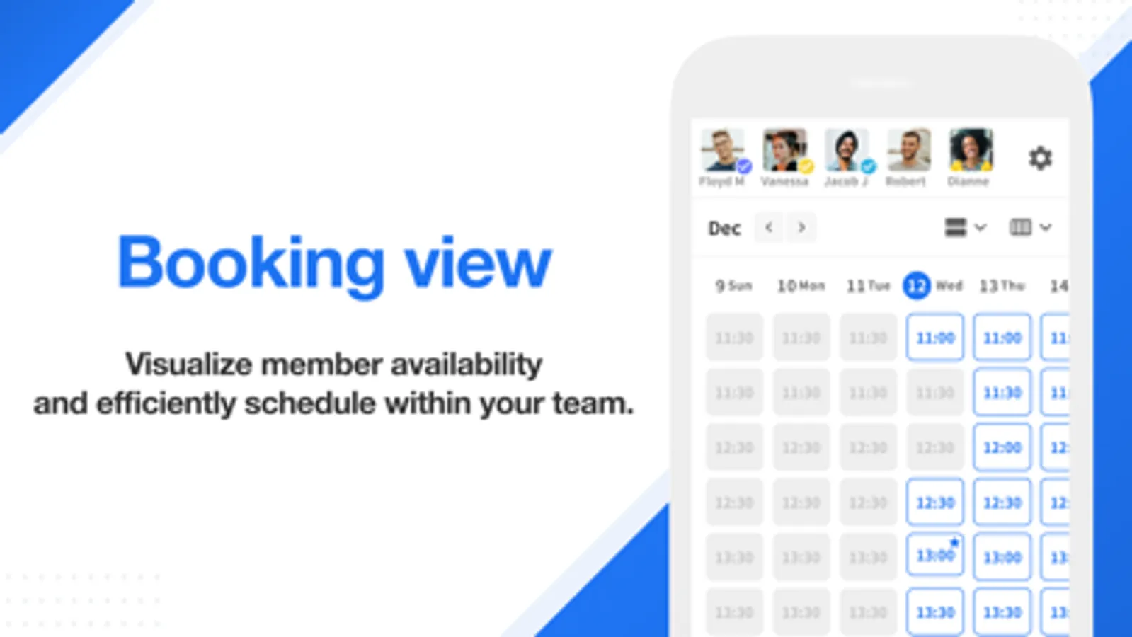 In contrast to the conventional calendar view, which mainly shows the filled appointments, this view shows only the available time slots as a single frame. Access to schedule coordination with members of the company is immediately accessible from the dashboard. Just by selecting the members you want to schedule, you can quickly select all available times in 15-minute increments and book them with a single click, just as you would on a booking page for outside the company. This makes scheduling within a team overwhelmingly more efficient.