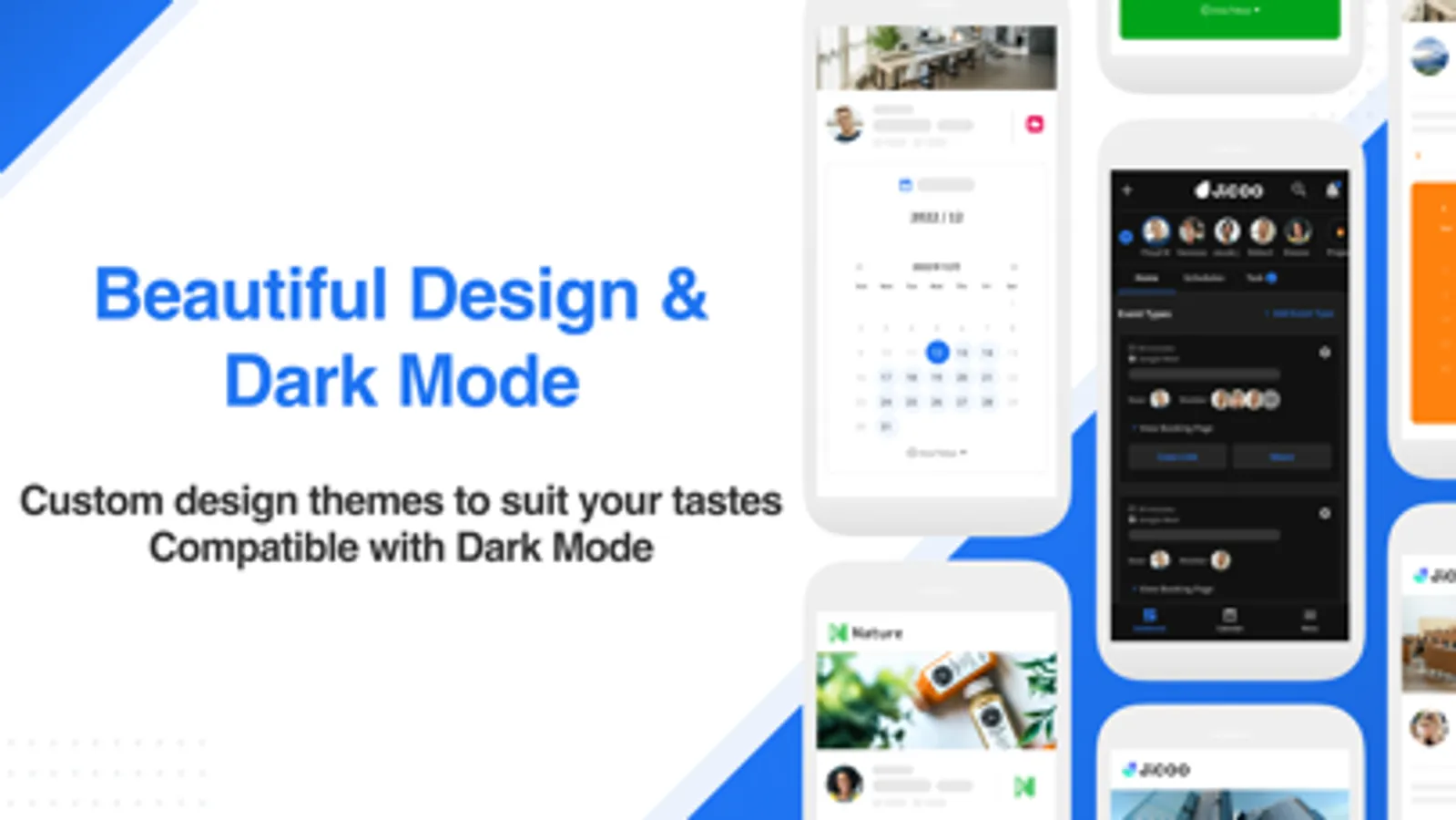 Dark mode is supported. The native iOS sharing feature allows you to quickly share a schedule booking link and a simple message without leaving the Jicoo app.