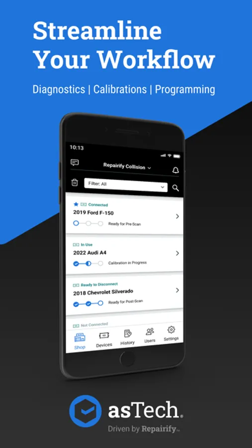 Let us help you improve your cycle time with our patented scanning tool and staff of experienced master technicians. Now access to OEM scans and expert collision diagnostics goes with you wherever you go. View your scan reports, submit new scan requests and review important documents in the asTech Connect app. Our team provides cutting-edge, expert diagnostics to provide safe and accurate repairs. Visit www.asTech.com, or call (888) 486-1166 to learn more about remote diagnostics with the asTech device by asTech, a Repairify company.