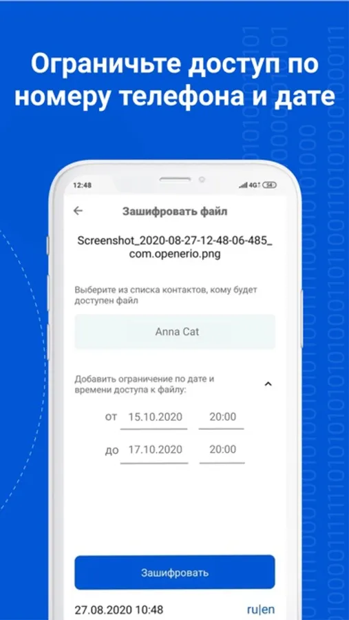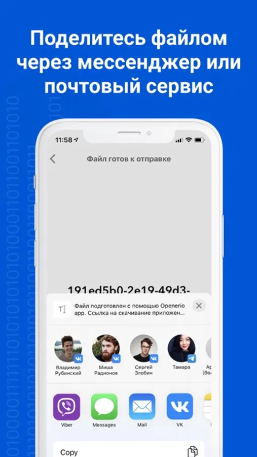 Openerio обеспечивает передачу Ваших файлов в зашифрованном виде и устанавливает к ним доступ по номеру телефона, а также при необходимости - по времени и дате открытия файла.