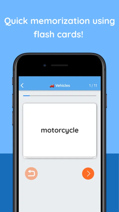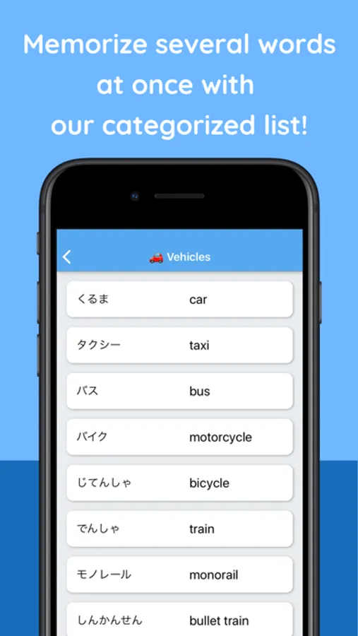 If you know the meaning of the word, swipe to reveal the next word. If you don't, tap on the card to know the meaning. There are two flash card modes: “English→ Japanese” and “Japanese → English”.