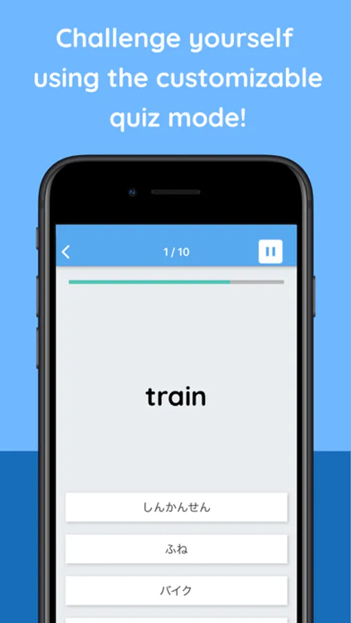 A multiple choice type quiz of Japanese words. There are 4 choices to choose from. There are two quiz modes, “English→ Japanese” and “Japanese → English”.