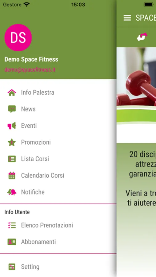 E' possibile, tramite l’app di “Space Fitness”, far gestire in totale autonomia corsi, lezioni e abbonamenti messi a disposizione dalla struttura sportiva.