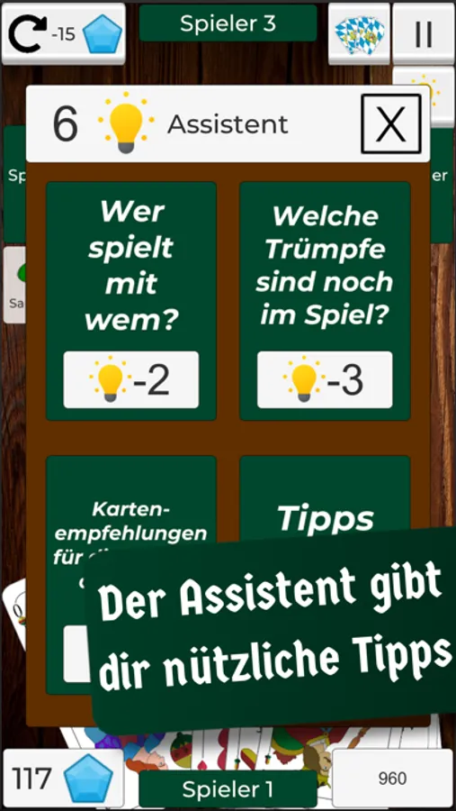 Falls du dir jemals nicht ganz sicher sein solltest, welche Karte du legen solltest, welche Trümpfe schon gelegt wurden, oder mit dem du spielst, kann dir der neue Assistent live im Spiel helfen.
