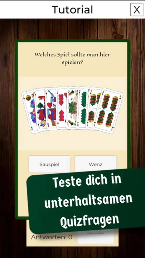 Schafkopf Offline bietet dir ein detailliertes Tutorial, welches dir das Spiel vom Sauspiel bis zum Ramsch vollständig erklärt und gängige Strategien beibringt.