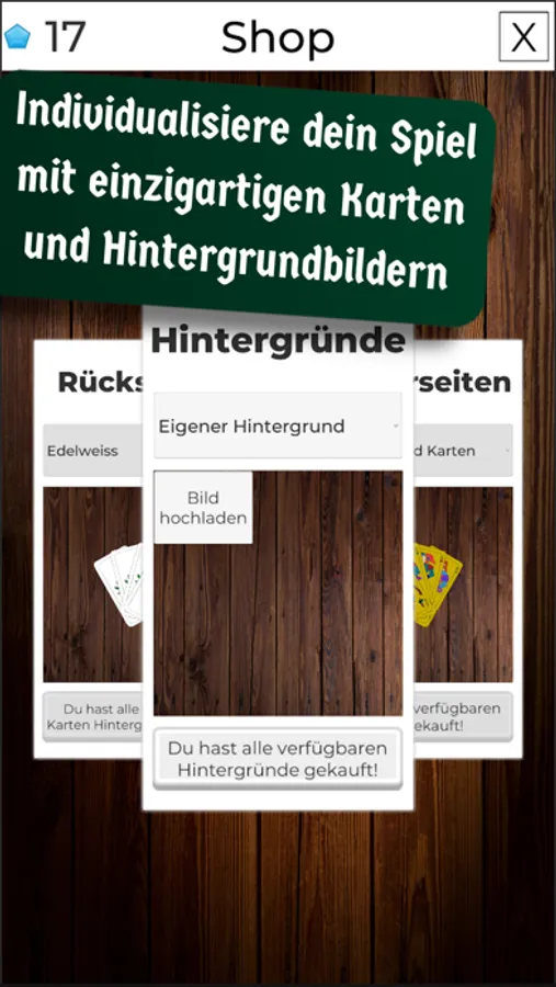 Alle Spiele (Ramsch, Wenz, Solo) können in den Einstellungen ein- und ausgestellt werden. Jegliche Zeitfenster, wie die Denkzeit der Computer-Gegner, oder die Zeit, in der die Karten auf dem Tisch liegen, können in den Einstellungen nach Belieben angepasst werden.