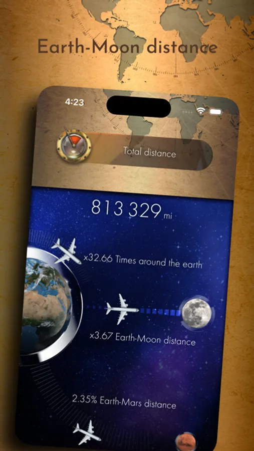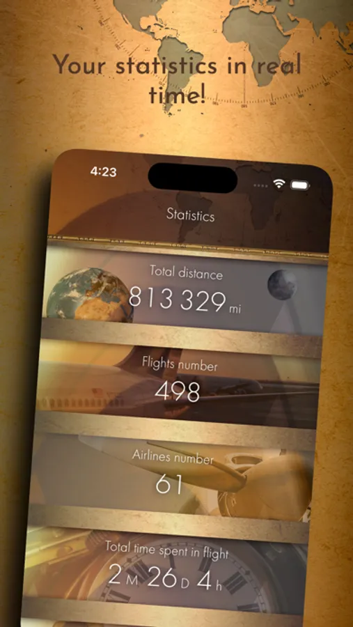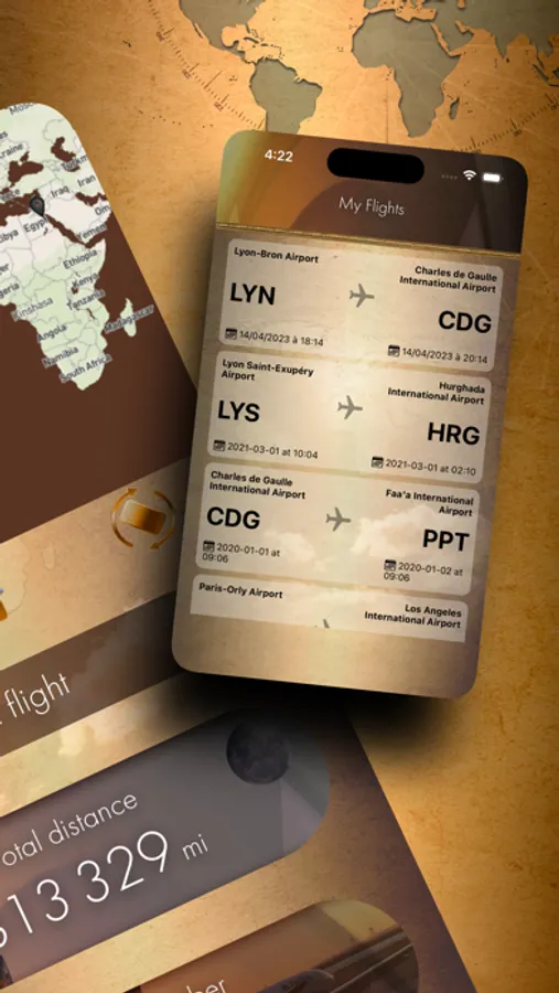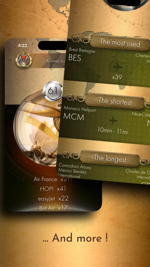⁃ Access your statistics in real time : The total distance traveled, the distance from earth to the moon, from earth to March, the total weight of your luggage in number of ducks, elephants and tyrannosaurs, the number of flights with the types of planes taken, the number and list of airlines used, the number and list of airports frequented and the number and list of countries visited.
