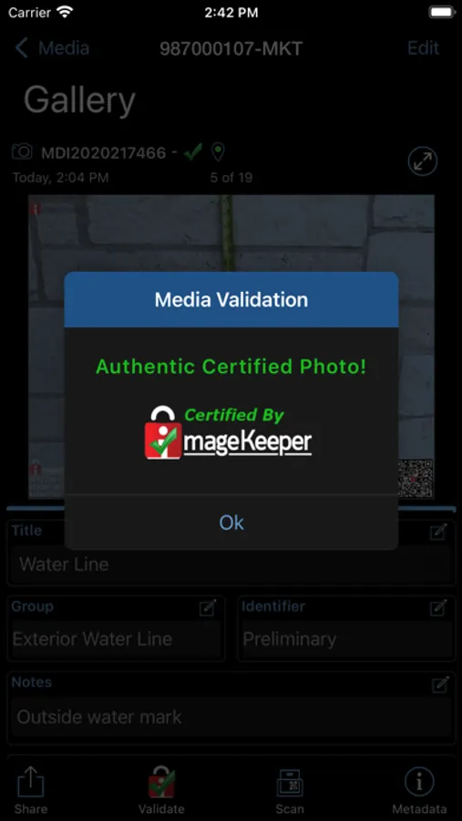 The ImageKeeper Adjuster App incorporates ImageKeeper’s Certified Media™ patented technology, which supports Department of Justice (DOJ) Federal Rules of Evidence (FRE) Rule 902 Self Authentication of Evidence. As a result, photos, videos, and audio recordings captured using the app will have a high evidentiary value in legal proceedings: With Certified Media™, you can validate your media hasn't been altered, with a simple button push.
