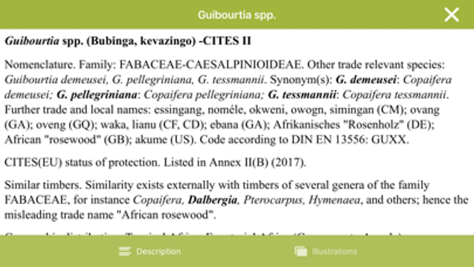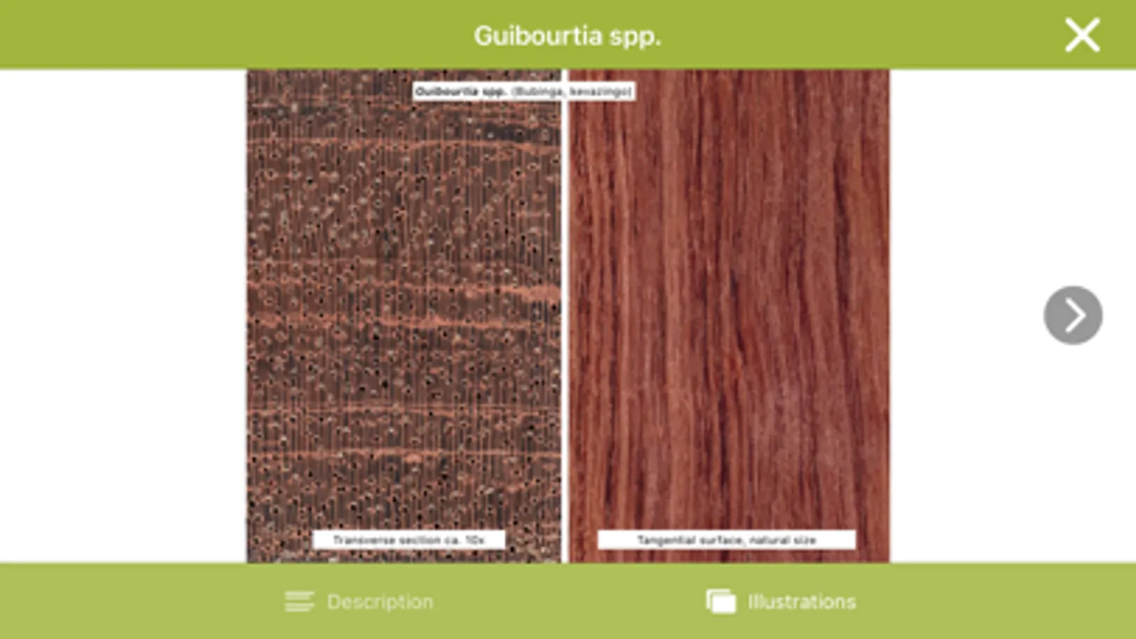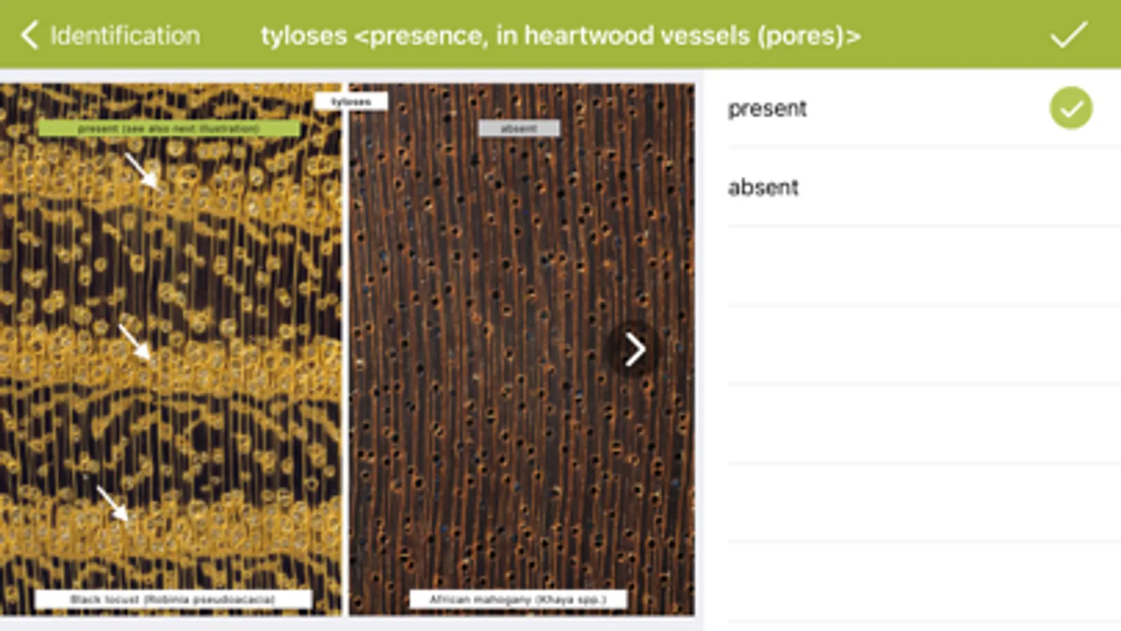 • interactive identification of the most important CITES-protected timbers (hardwoods and softwoods) based on macroscopic features to be observed with the unaided eye or with a hand lens