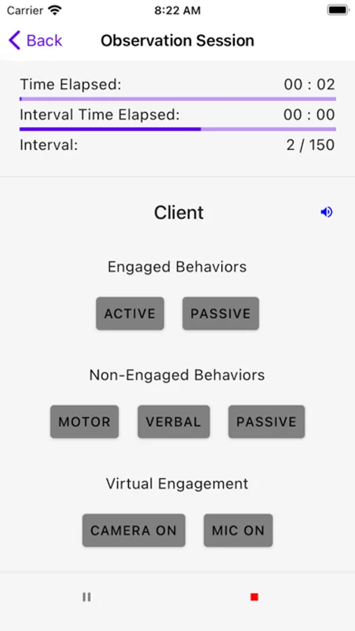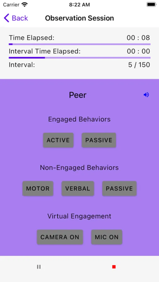 Track behavior, systematically. Perform functional behavior assessments using this behavior observation of students (BOSS) app easily. You can customize the duration and interval to tailor observations to your liking. Focus on tracking the main categories of behavior, Engaged, Non-Engaged, and Virtual behaviors. It’s never been easier to conduct systematic behavior observation.