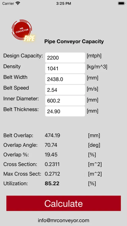 Capacity calculations for a pipe conveyor. All calculations are metric.