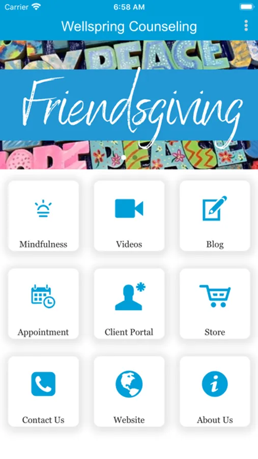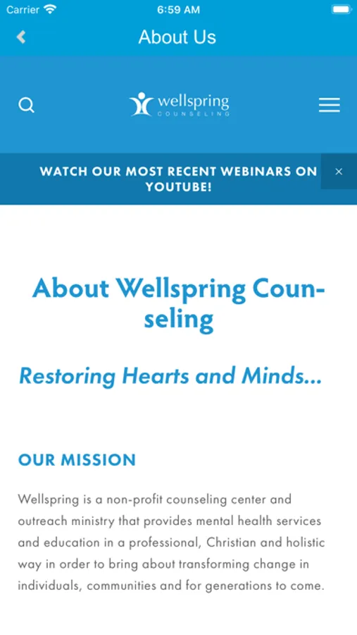The Wellspring Counseling App is a tool to easily access current mental health resources, request an appointment, access client portal, and see current events.