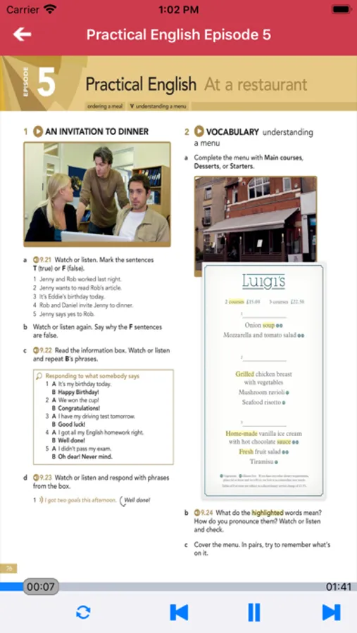 * 在线练习中包含发音视频,学员可在此观看正确、地道的英文发音视频,参与到Rob和Jenny的短剧中。