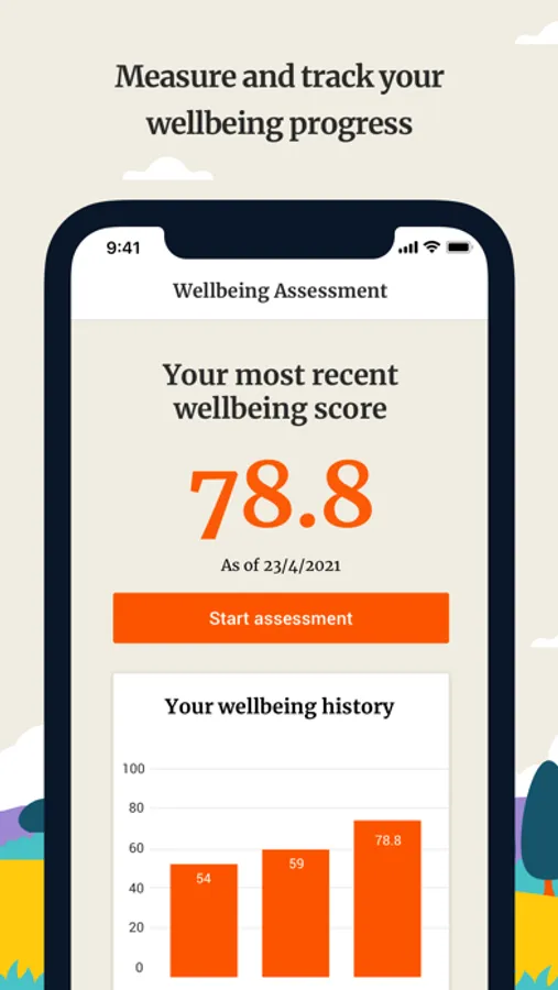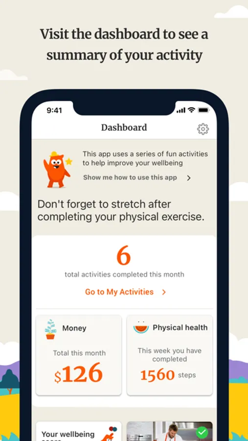 You can choose which activities you want to complete, set reminder notifications, view your achievements, complete the Advanced Wellbeing Assessment to measure your wellbeing, and view changes to your wellbeing over time.