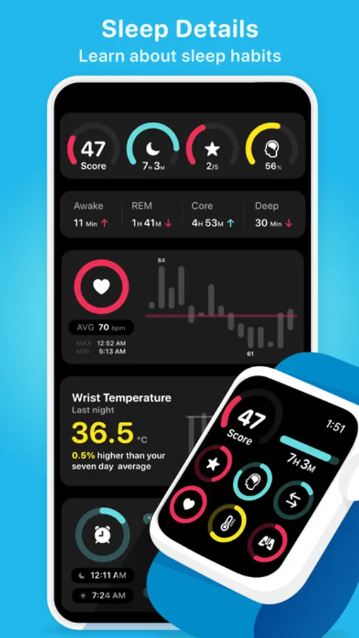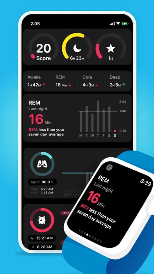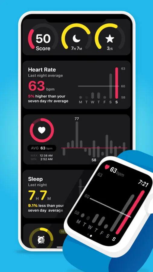 Track your sleep related data and see your daily sleep score based on data collected by your Apple Watch.