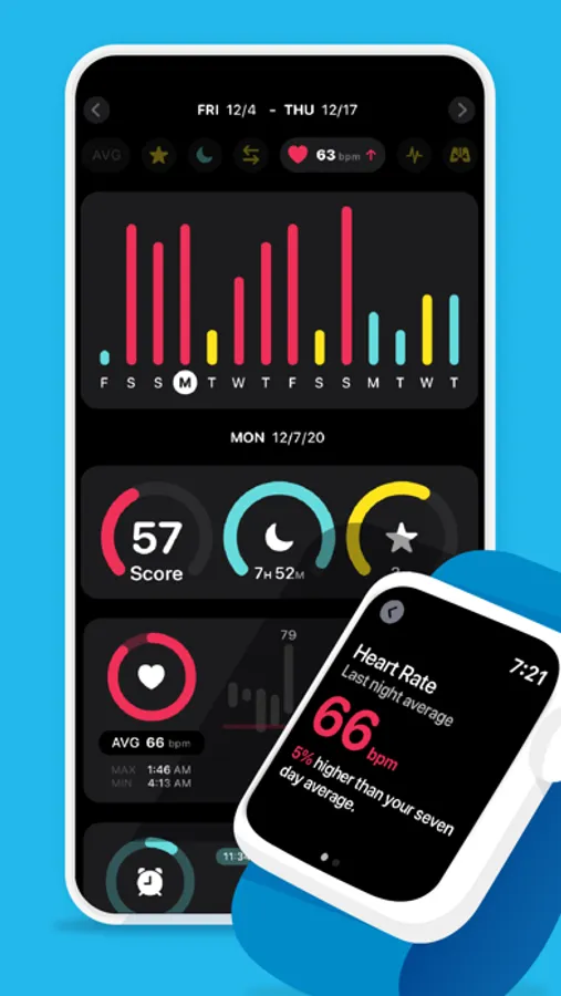 How are different health metrics used to calculate your last nights sleep score? As an example your score will be lower if your last nights heart rate average is higher than your weekly resting heart rate average. In this case the heart rate ring will be colored red so you can easily spot which metrics are negatively affecting your score.