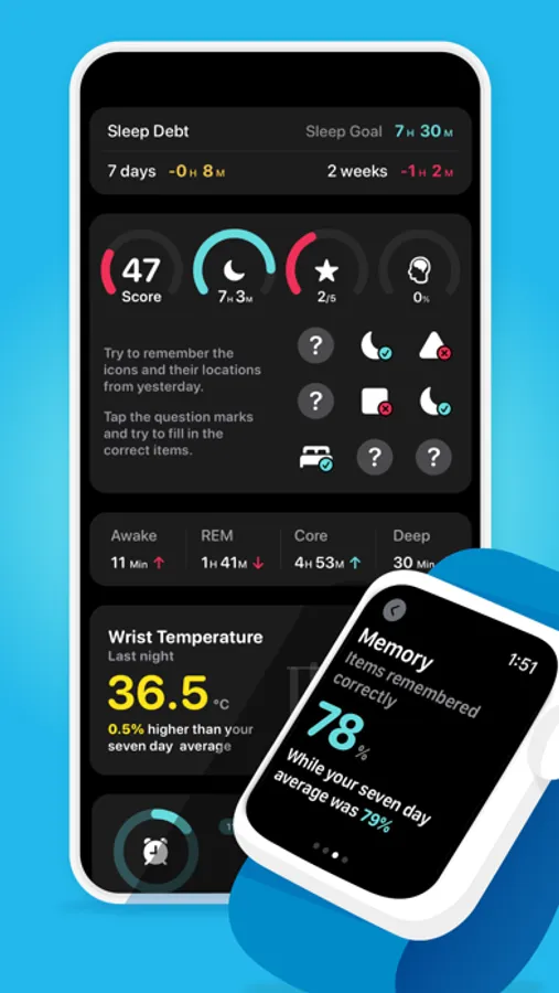 -Sleep has an important role in the performance of your memory. To highlight this, we added a simple memory test in Sleep Details: 1) Before going to bed try memorize a set of icons and their location. 2) Then after waking up, try remember and fill in these items. 3) New icons and locations will be generated for each day, so you can track your long-term progress by completing a new test each day.