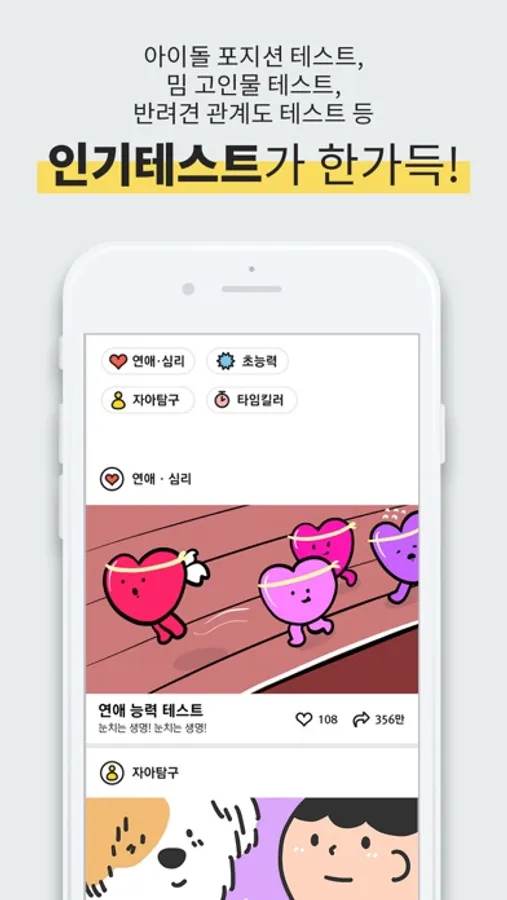 나의 연애 스타일부터 MBTI까지 다양한 주제의 콘텐츠와 함께 내가 어떤 사람인지 고민해봐요!